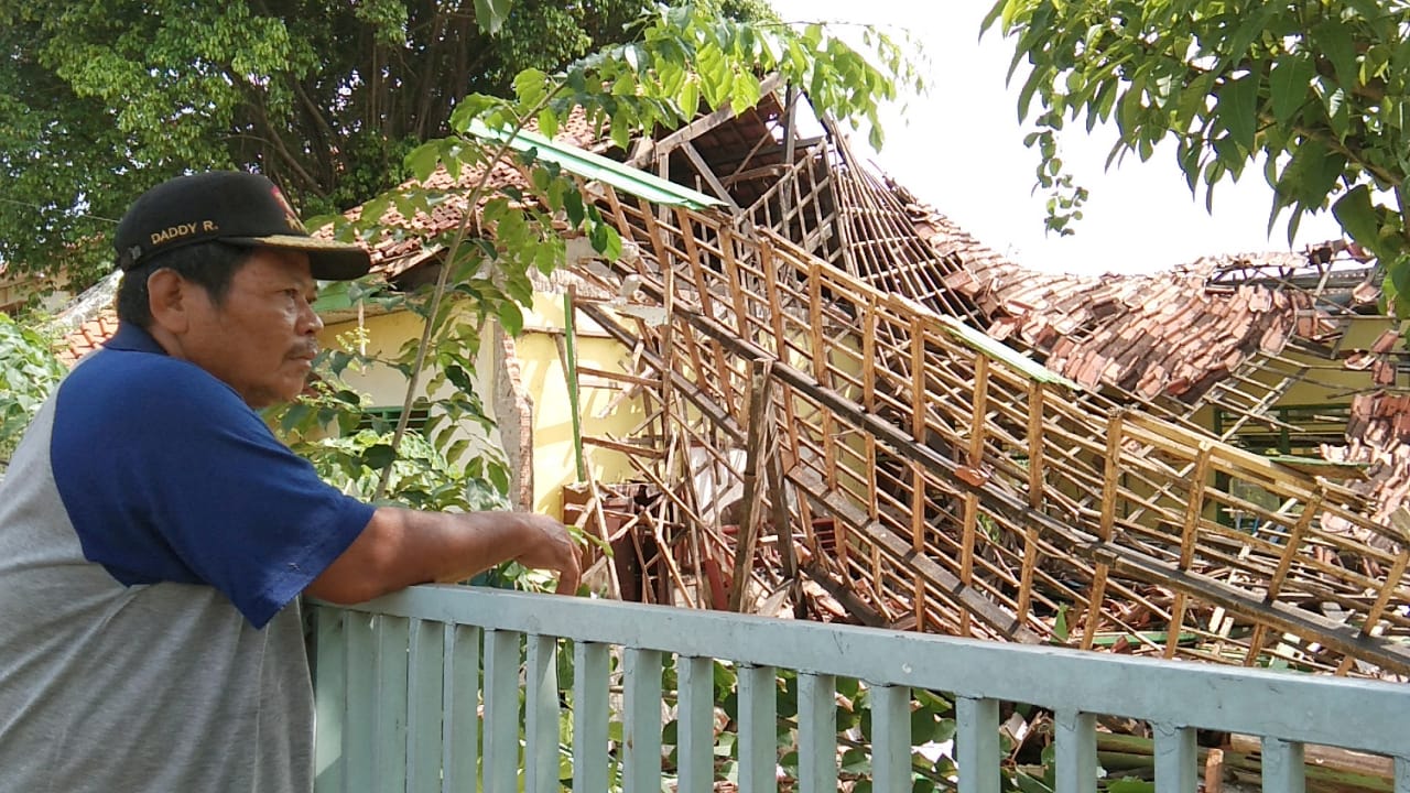 Penjaga SMPN 1 Kaliwedi, Haris saat melihat kondisi bangunan laboratorium IPA sekolah setempat yang ambruk.* (Foto: Islah/Suara Cirebon)