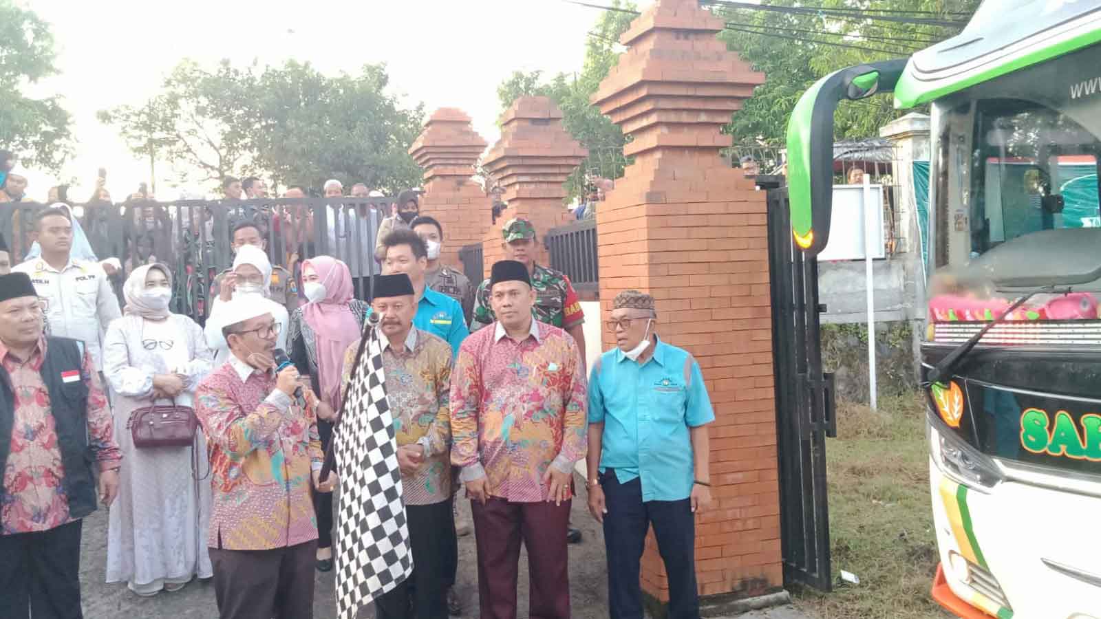 Bupati Cirebon, Drs H Imron MAg melepas keberangkatan sebanyak 404 calon jemaah haji Kabupaten Cirebon yang masuk dalam kloter kedua di Asrama Haji Watubelah, Sumber, Jumat (3/6/2022).* (Foto: Islah/Suara Cirebon)
