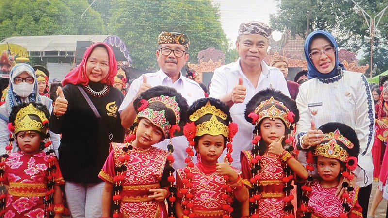 Wamenes PDTT, Budi Arie Setiadi, bersama Bupati dan Wakil Bupati Cirebon serta penari topeng cilik, saat menghadiri penutupan Gegesik Kreatif Festival (GKF), Rabu (8/6/2022).* Foto: Kirno/SC