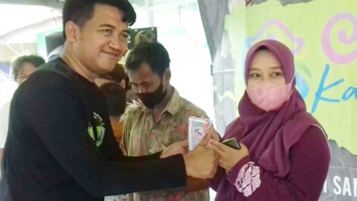 SUB KOORDINATOR Pengelolaan Sampah Kabupaten Cirebon, Teguh Budiman saat memberikan emas kepada masyarakat yang menukarkan sampah.* (Foto: Vicky/Suara Cirebon)