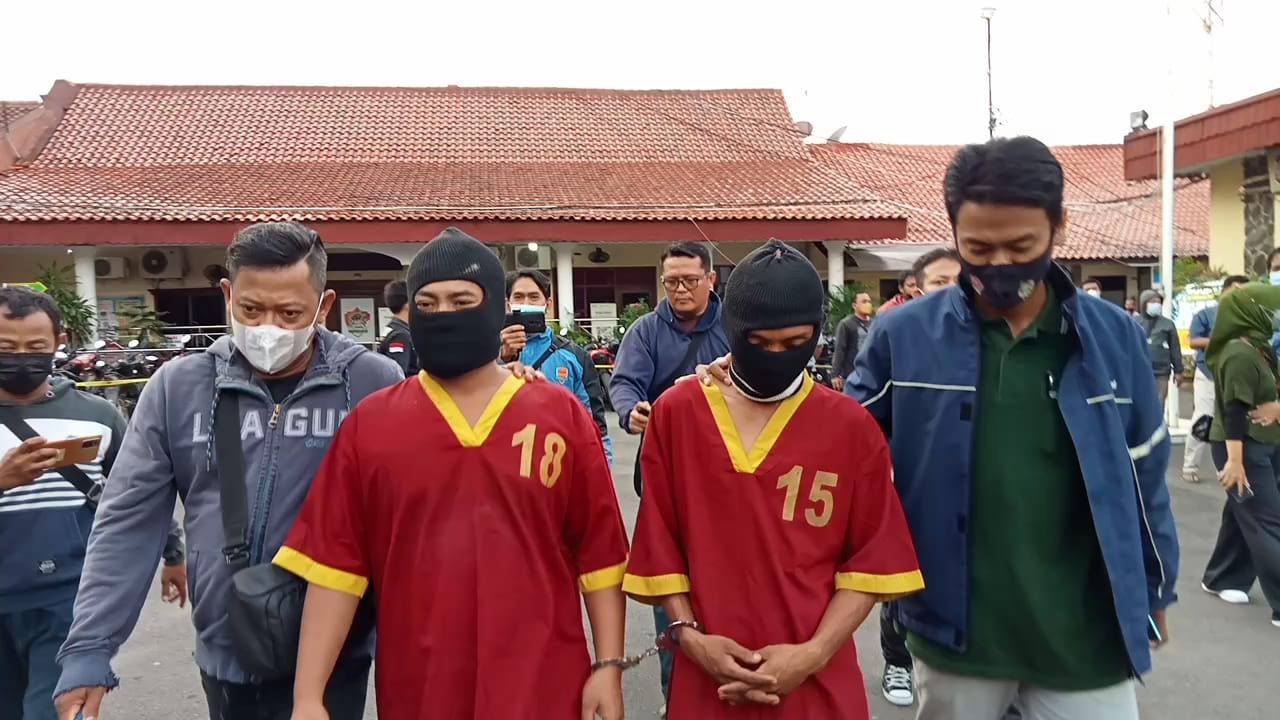 Dua tersangka pencuri AC di salah satu rumah di Desa Sutawinangun, Kecamatan Kedawung, Kabupaten Cirebon digelandang petugas saat konferensi pers di Polres Cirebon Kota, Selasa (14/6/2022).* (Foto: Istimewa)