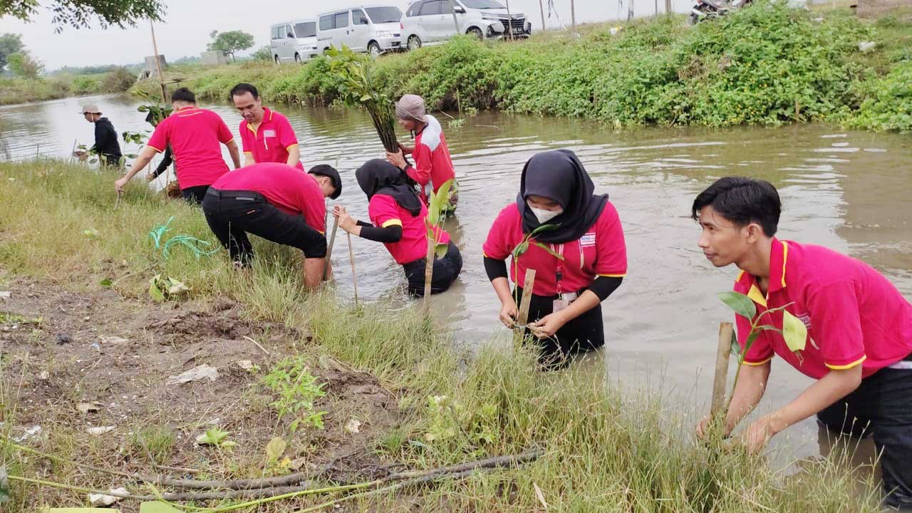 KABUPATEN CIREBON, SC- Pemerintah Desa (Pemdes) Muara, Kecamatan Suranenggala, Kabupaten Cirebon bersama karang taruna dan pihak kecamatan setempat melakukan penanaman mangrove di Sungai Muara, Selasa (14/6/2022).