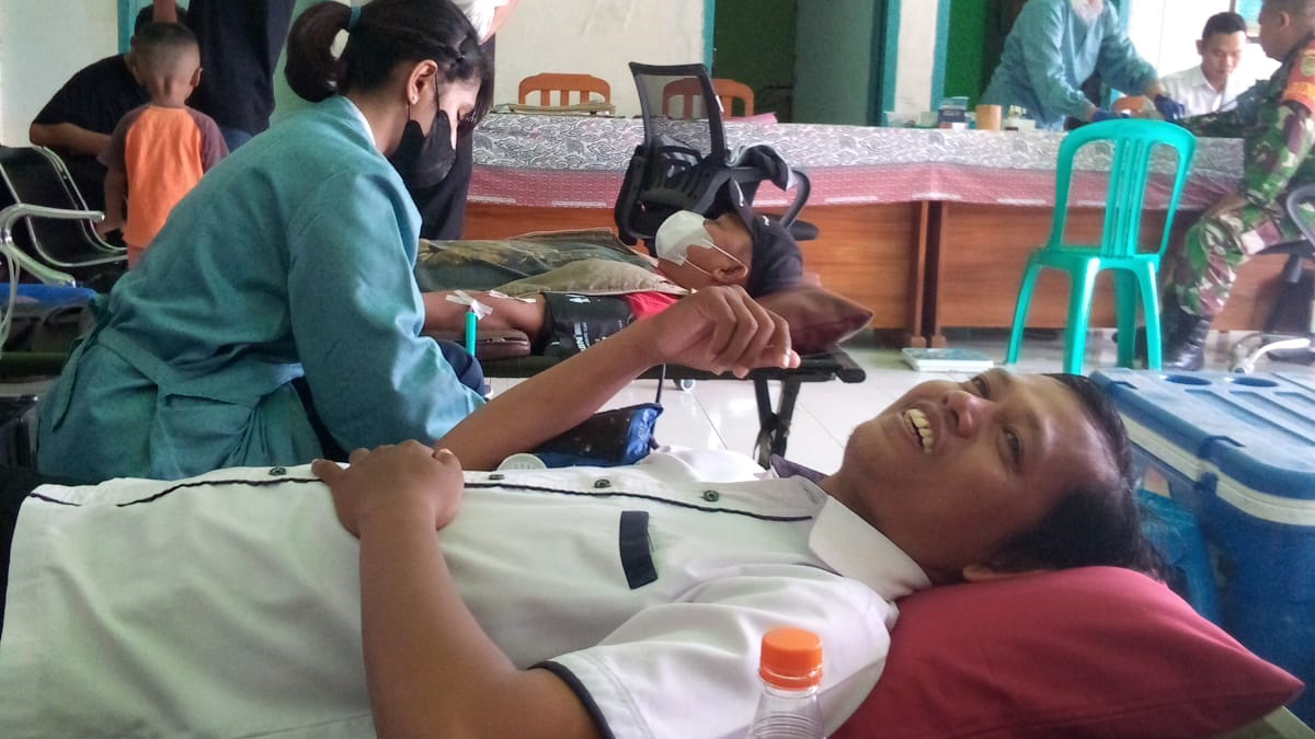 Kuwu Gagasari Tamam Haryanto saat me-donorkan darahnya, bertempat di kantor desa setempat, Rabu (22/6).* Foto : Baim/SC