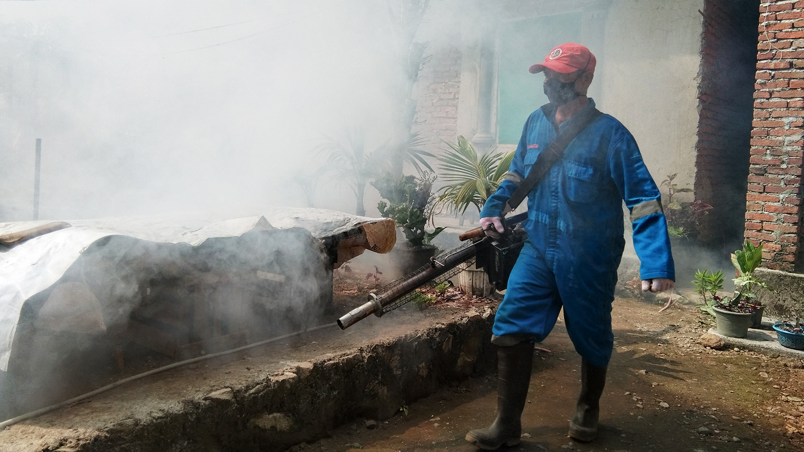 Petugas fogging dari Dinkes Kabupaten Cirebon melakukan pengasapan pekarangan hingga dalam rumah warga Desa Pangkalan, desa terbanyak kasus DBD di Kecamatan Plered, Kamis (23/6/2022).* Foto: Islah/SC