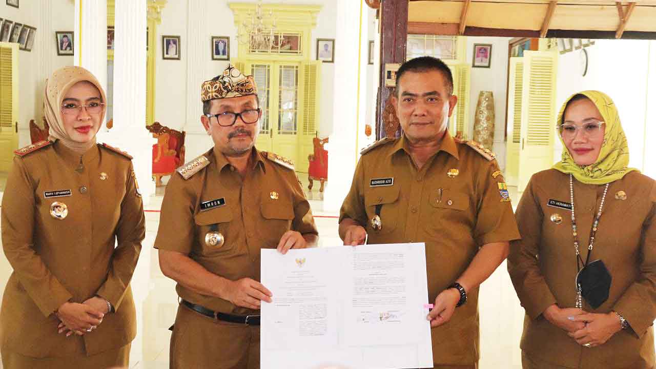 Bupati Cirebon, H Imron dan Wali Kota Cirebon, H Nashrudin Azis menunjukkan MoU batas wilayah, usai penandatanganan di Pendopo Bupati Jalan Kartini, Kota Cirebon, Selasa (5/7/2022).* Foto: Islah/SC