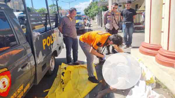 POLISI MELAKUKAN indentifikasi pada mayat yang ditemukan di gerbang halaman Kelurahan Majalengka Kulon.*(Foto: Abr/Suara Cirebon)