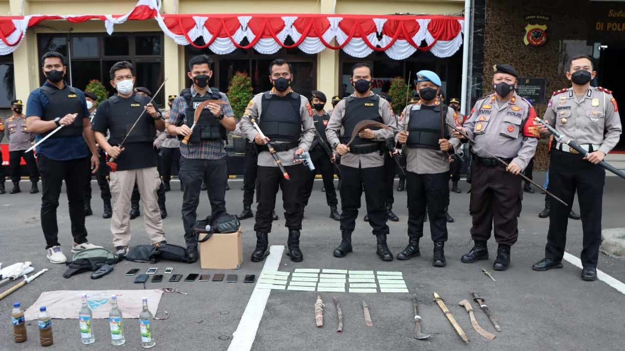 Kapolresta Cirebon, Kombes Pol Arif Budiman menunjukkan sejumlah senjata tajam dan minuman keras yang disita dari markas ormas di Desa Beberan, Kecamatan Palimanan, Kabupaten Cirebon, Minggu (17/7/2022).* Foto: Humas Polresta Cirebon