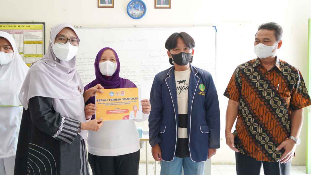 CIREBON, SC- Anggota DPR RI, Netty Prasetiyani Aher menyerahkan beasiswa Program Indonesia Pintar (PIP) secara simbolis kepada sejumlah peserta didik di Kota Cirebon, Rabu (20/7/2022).