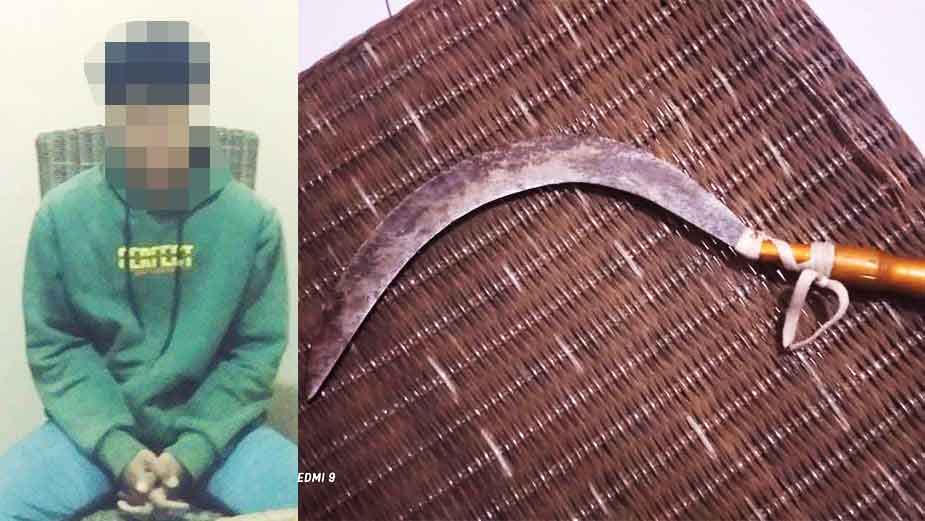 Terduga pelaku pembacokan saat tawuran antarpelajar di depan Polsek Weru, Kabupaten Cirebon berinisial M berhasil ditangkap bersama barang bukti celurit, Jumat (22/7/2022).* (Foto: Istimewa)
