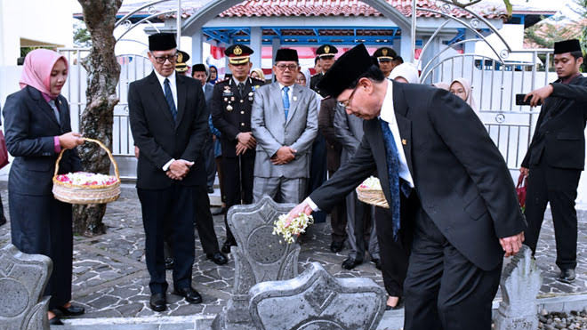 MAJALENGKA, SC- Bupati H. Karna Sobahi bersama jajaran pejabat di pemerintahan Kabupaten Majalengka melakukan ziarah ke makam Pahlawan Nasional KH Abdul Halim. Kegiatan ziarah dan doa bersama di makam pahlawan merupakan rangkaian kegiatan dalam rangka peringatan HUT ke-77 Kemerdekaan RI.