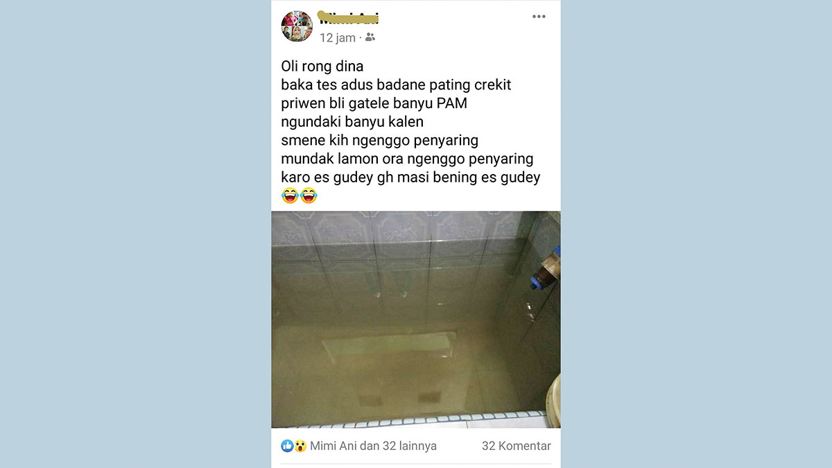 “Oli rongdina baka tes adus badane pating crekit, priwen bli gatele banyu PAM ngundaki banyu kalen, semene kih nganggo penyaring. Mundak lamon ora nganggo penyaring, karo es gudey gah masih bening es gudey (dapat dua hari kalau habis mandi badan pada gatel crekit, gimana tidak gatal air PAM melebihi air sekolan, segini ini pakai penyaring. Lebih-lebih lagi kalau tidak pakai penyaring, sama es guday juga masih bening es guday),” tulis akun tersebut dalam bahasa Cirebon.