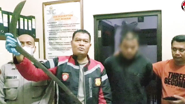 Tangkapan layar Kapolsek Weru, Kompol Endang Kusnandar didampingi jajaran menunjukkan tersangka anggota geng motor berikut barang bukti sebilah senjata tajam sepanjang 1,2 meter.*