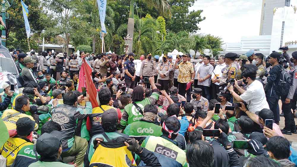 Wali Kota Cirebon, H Nashrudin Azis bersama pimpinan dan anggota DPRD setempat menemui ratusan pengemudi ojek online (ojol) yang melakukan unjuk rasa menolak kenaikan harga BBM, Rabu (7/9/2022).* Foto: Surya/SC
