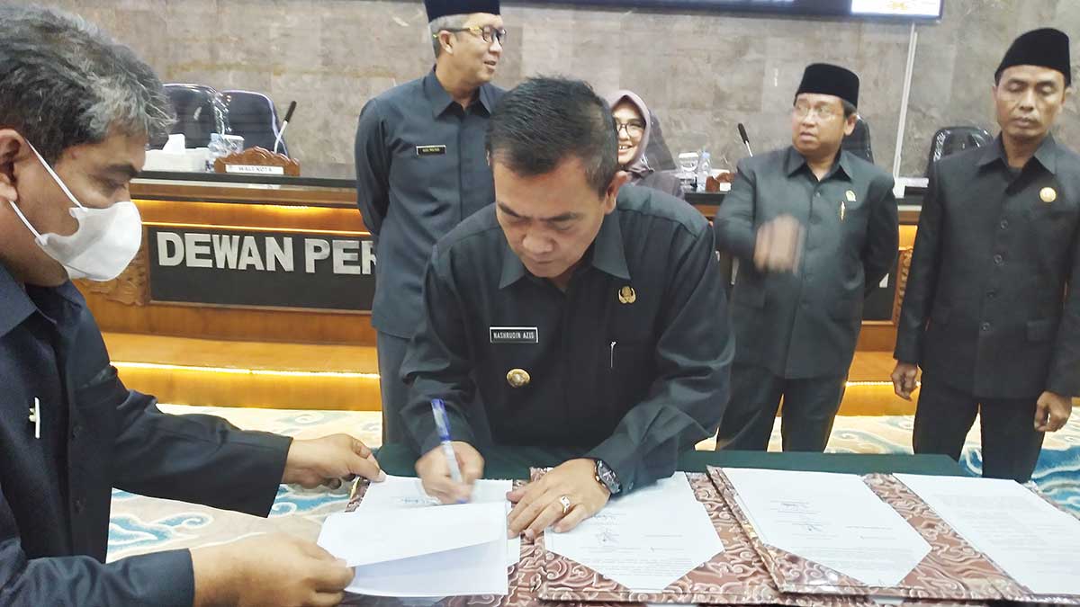 Wali Kota Cirebon, H Nashrudin Azis menandatangani berita acara penyampaian Raperda Perubahan APBD Tahun 2022 pada Rapat Paripurna DPRD Kota Cirebon, Senin (12/9/2022).* Foto: Surya/SC