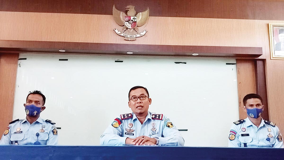 Kepala Lapas Narkotika Kelas II Gintung Cirebon, Nur Bambang Supri Handono (tengah) saat jumpa pers terkait pengetatan pengawasan alat komunikasi warga binaan, Selasa (13/9/2022).* Foto: Sukirno/Suara Cirebon