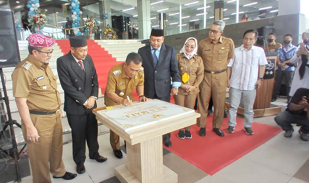 Wali Kota Cirebon Nashrudin Azis menandatangani prasasti peresmian atau grand opening A.S.S Mall, Selasa (13/9/2022).* Foto: Surya/Suara Cirebon