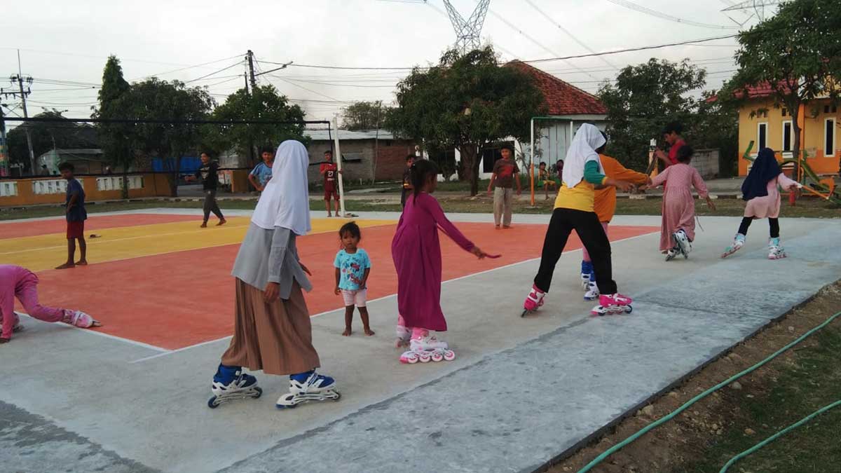 SEJUMLAH ANAK Desa Cisaat, Kecamatan Waled, Kabupaten Cirebon, memanfaatkan halaman balai desa setempat untuk bermain sepatu roda, maupun aktivitas lainnya, Selasa, (20/9).* Foto: Baim/SC