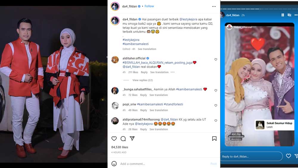 Pada postingan itu, Fildan DA4 memposting fotonya bersama Lesti Kejora dan Rizky Billar dengan caption, “Hai pasangan duet terbaik @lestykejora apa kabar mu smoga baik2 saja ya, kami semua sayang sama kamu, tetap kuat ya kami semua di sini senantiasa mendoakan yang terbaik untukmu”.