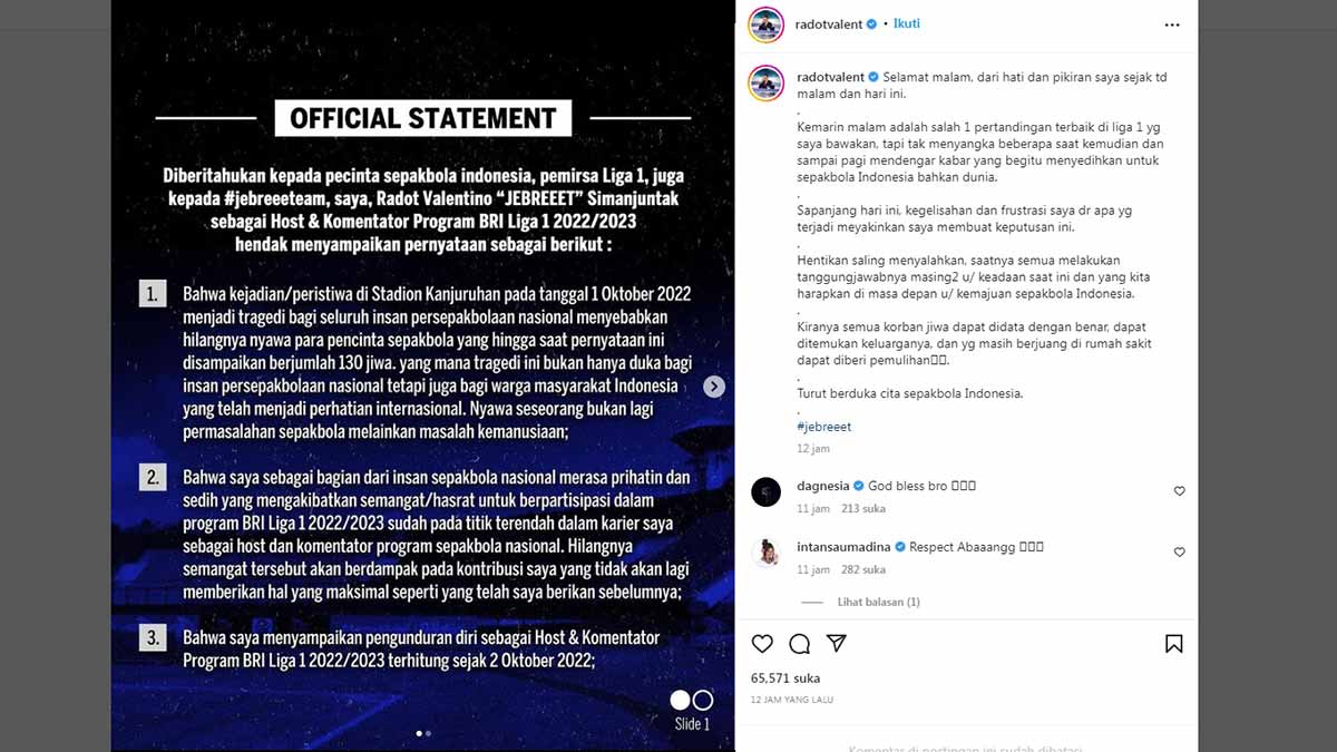 Tangkapan layar Official Statement Bung Jebreeet Radot Valentino Simanjuntak yang menyatakan mengundurkan diri sebagai Host dan Komentator Program BRI Liga 1 2022/2023 di akun media sosial instagram miliknya @radotvalent.* Foto: Taangkapan layar dari akun Instagram @radotvalent