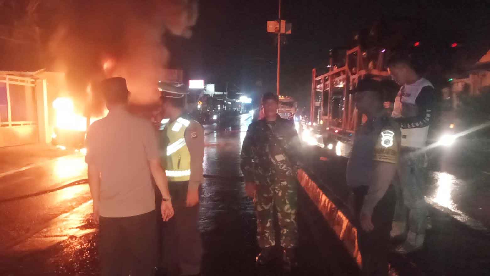 Mobil Suzuki Carry pengangkut BBM terbakar di Jalan By Pass Arjawinangun, Desa Kebonturi, Kabupaten Cirebon pada Selasa, 4 Oktober 2022 malam sekitar pukul 20.30 WIB. (Foto: Humas Polsek Arjawinangun)