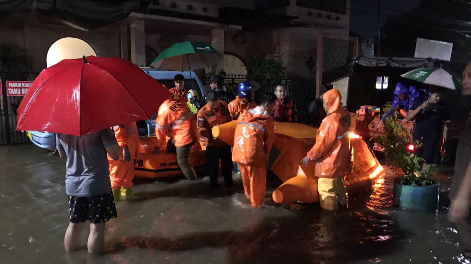 Petugas BPBD tengah mengevakuasi warga Kelurahan Pekiringan, saat banjir, Selasa (25/10/2022) malam lalu.* (Foto: Surya/Suara Cirebon)