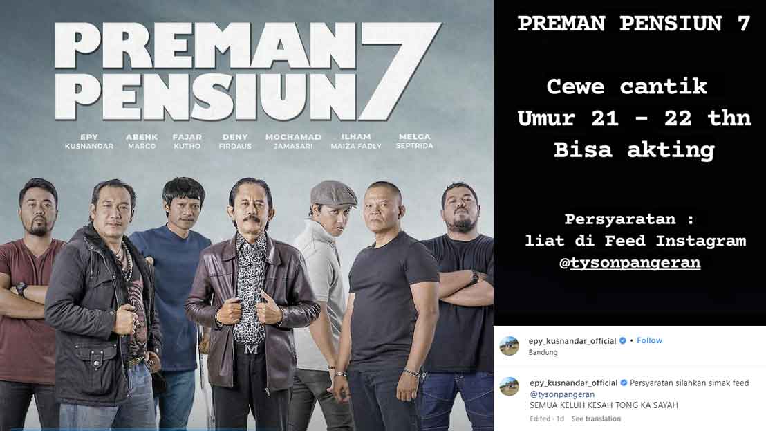 “Preman Pensiun 7. Cewek cantik, umur 21-22 tahun, bisa akting,” tulis Epy Kusnandar di akun Instagram pribadinya, Minggu (30/10/2022).