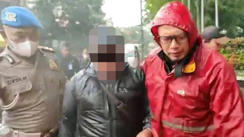 Lelaki bertubuh gempal, berusia sekitar 50 tahun, dalam guyuran hujan, diamankan masuk ke dalam mobil kepolisian. Diduga terkait dengan penyebab kebakaran Balai Kota Bandung.