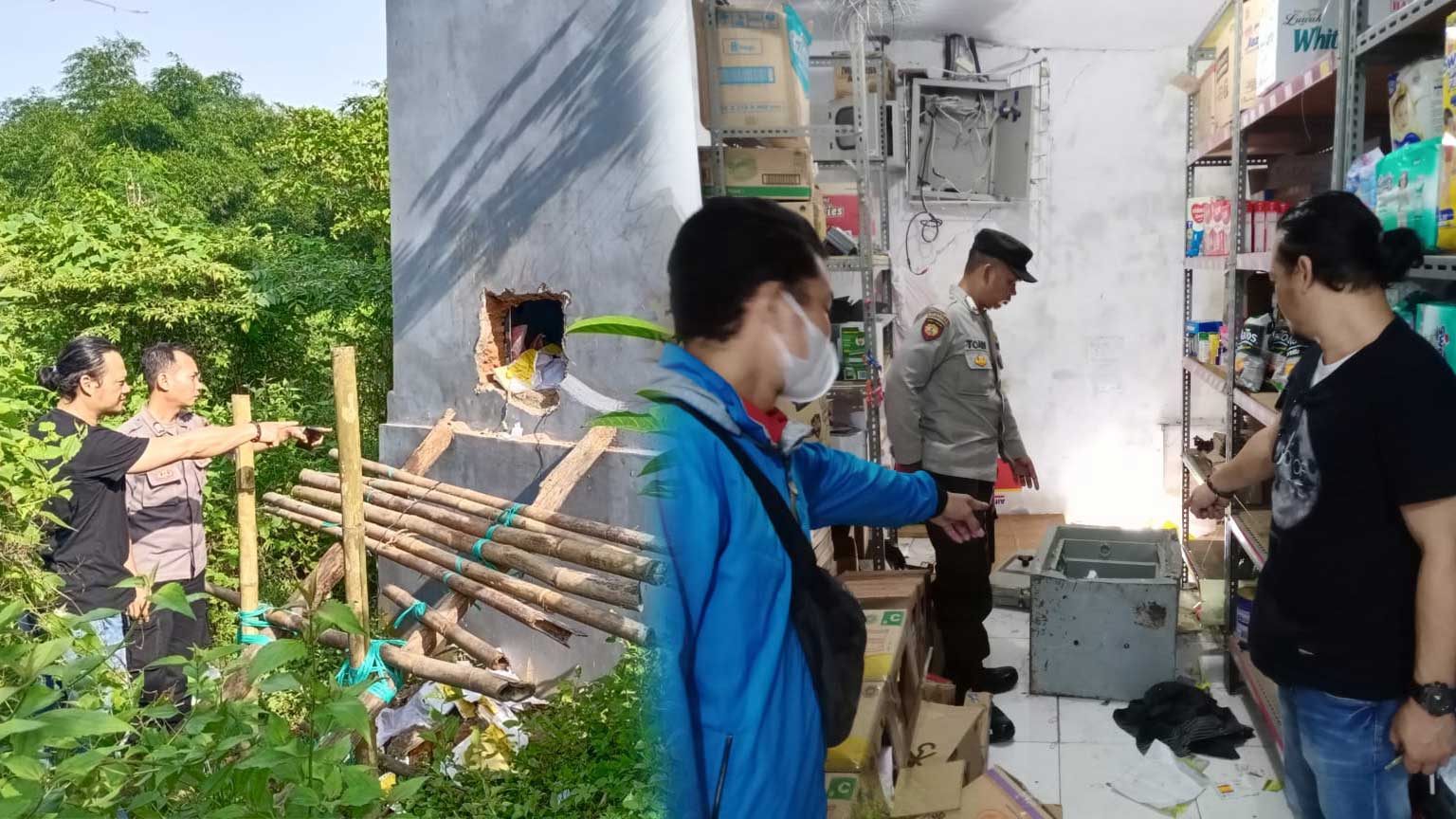 FOTO KOLASE: Unit Rekrim Polsek Ciwaringin, Kabupaten Cirebon menunjukan tembok minimarket yang dijebol dan kondisi salah satu minimarket di Desa Budur, Kecamatan Ciwaringin yang berantakan usai dibobol pencuri.*