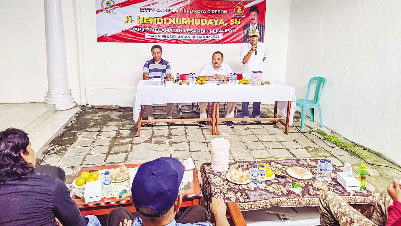 Ketua DPC Gerindra Kota Cirebon, Eman Sulaeman (berdiri) saat menghadiri reses Anggota DPRD Kota Cirebon dari partainya, Hendi Nurhudaya di Jaln Kebonpring, Selasa (15/11/2022).* Foto: Surya/Suara Cirebon
