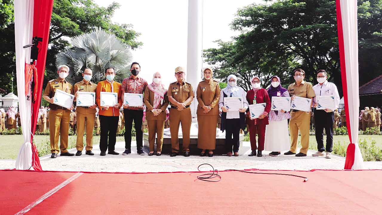 Bupati Cirebon (tengah mengenakan topi) didampingi Wabup Ayu dan Kadinkes (lima dari kiri) bersama sejumlah nakes yang mendapat penghargaan usai upacara HKN ke-58 di depan kantor Setda Kab Cirebon, Senin (14/11/2022).* Foto: Humas Dinas Kesehatan Kabupaten Cirebon