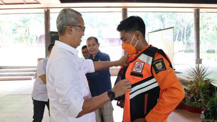SEKDA KOTA Cirebon Agus Mulyadi memakaikan seragam BPBD kepada salah satu peserta TCR yang ikut pelatihan penanggulangan bencana di Cirebon, Rabu (16/11/2022).* Foto : Surya/Suara Cirebon