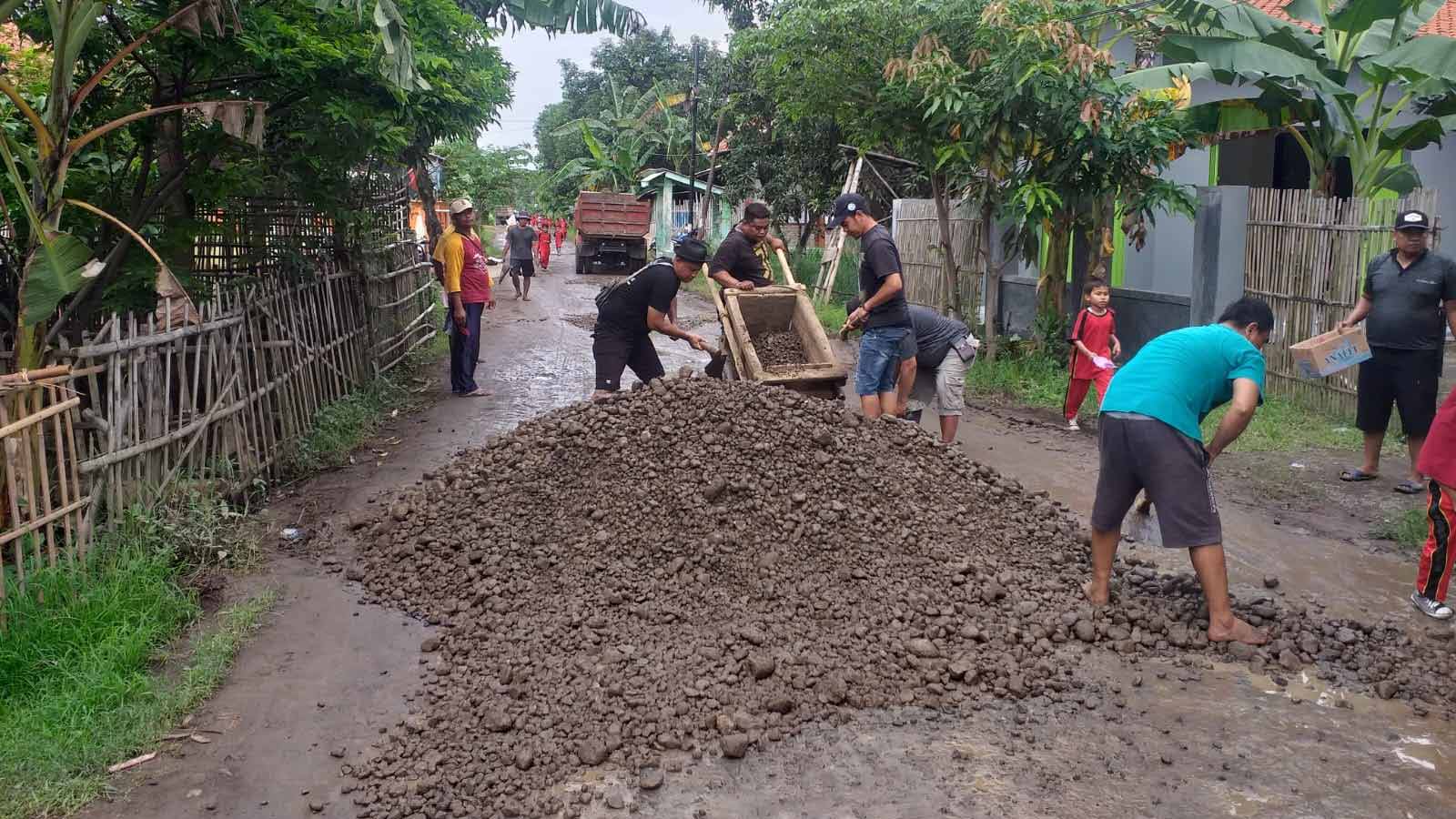 MASYARAKAT DESA Gembongan Mekar, Kecamatan Babakan, Kabupaten Cirebon, saat bergotong royong menguruk jalan poros penghubung Kecamatan Babakan- Karangsembung, menggunakan Sirtu, Sabtu ( 26/11/2022).* Foto : Baim/Suara Cirebon