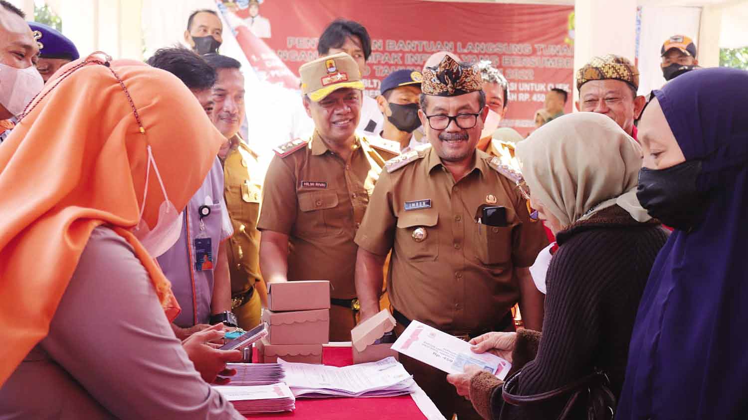 Bupati Cirebon, H Imron (kedua dari kanan) didampingi Sekda, Hilmy Rivai (kanan) menyaksikan pencairan BLT BBM kepada warga di Kecamatan Mundu, Senin (28/11/2022).* Foto: Diskominfo Kabupaten Cirebon