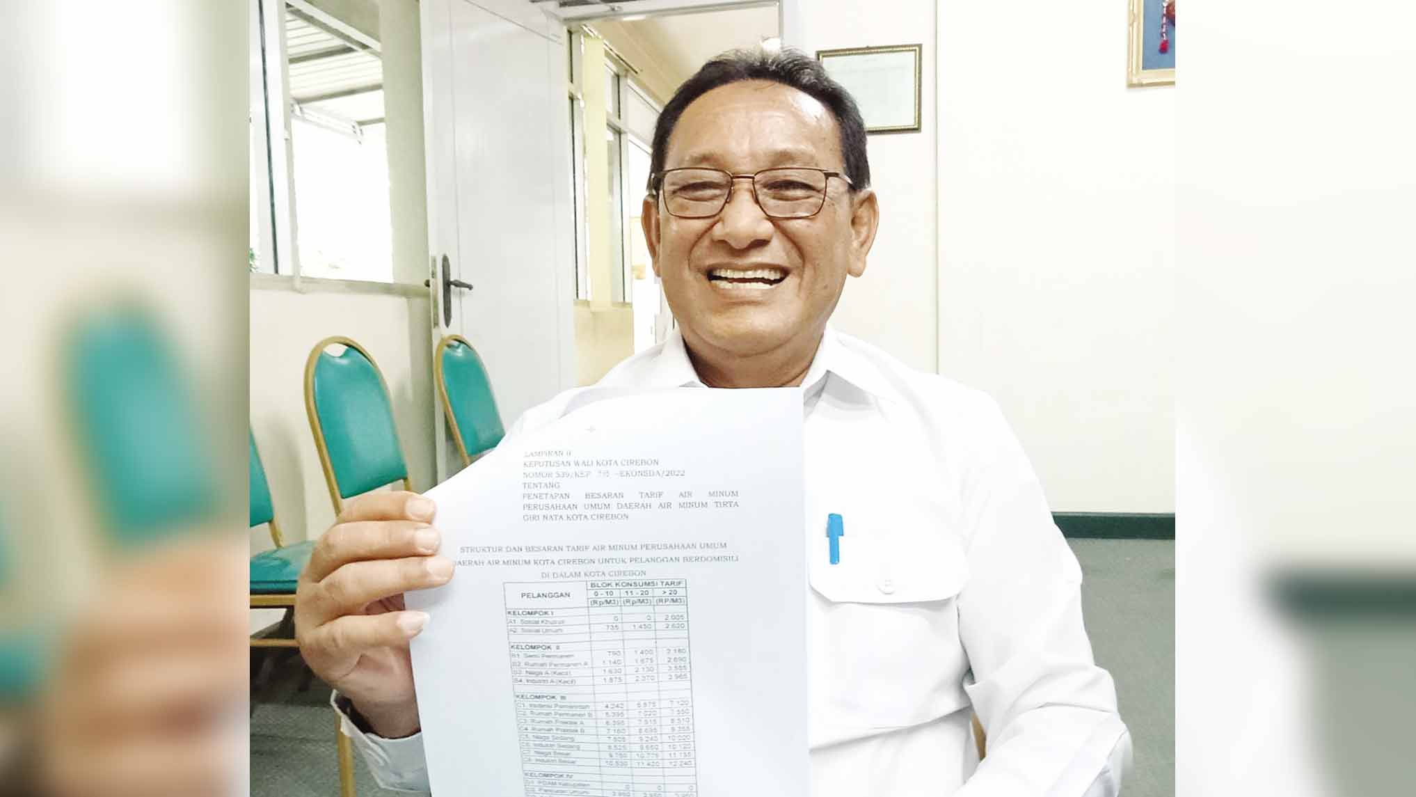 Direktur Perumda Air Minum (PDAM) Tirta Giri Nata Kota Cirebon, Sofyan Satari menunjukkan surat keputusan penyesuaian tarif air minum untuk pelanggan, saat ditemui di ruangan kerjanya, Rabu (30/11/2022).* Foto: Surya/Suara Cirebon