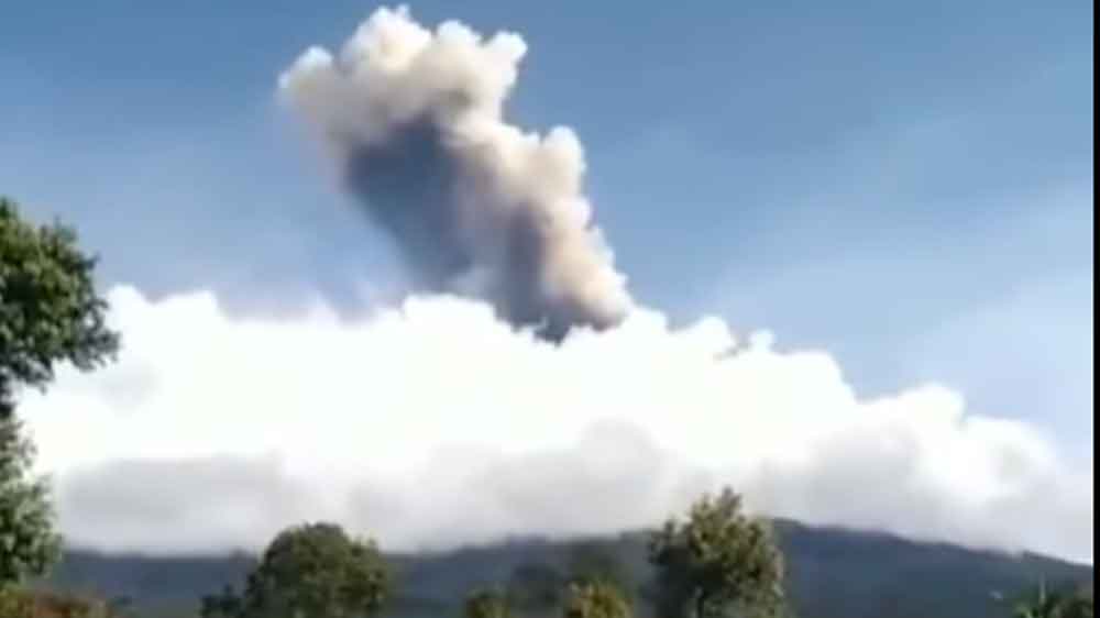 Kolom abu akibat erupsi atau letusan Kerinci, gunung dengan ketinggian 4.505 meter di atas permukaan laut berwarna kelabu hingga hitam.