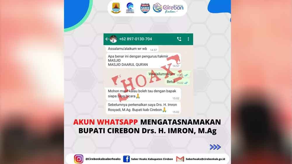 Kepala Dinas Komunikasi dan Informatika (Diskominfo) Kabupaten Cirebon yang juga penanggungjawab Saber Hoaks Kabupaten Cirebon, Nanan Abdul Manan menegaskan, nomor WhatsApp yang mengatasnamakan Bupati Cirebon ini dipastikan bukan milik Bupati Cirebon, H Imron MAg.