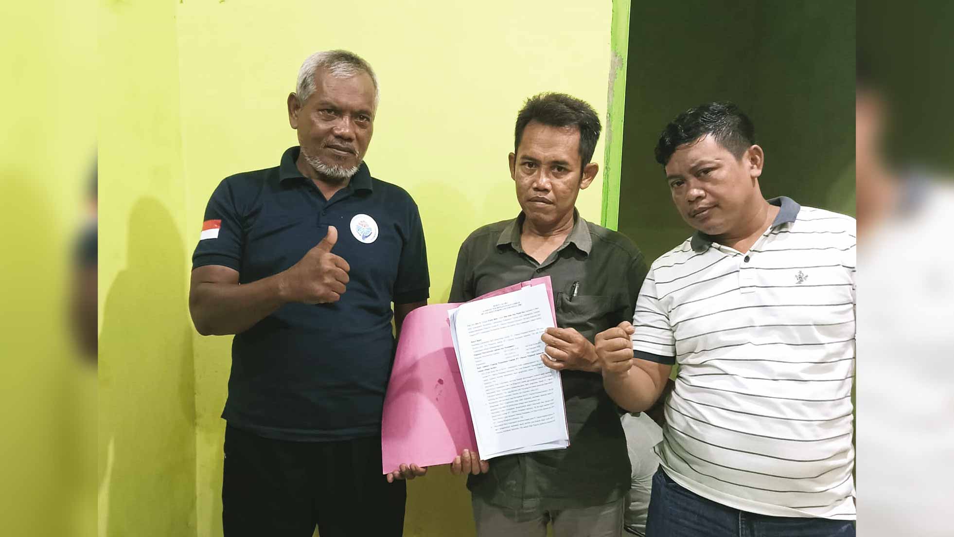 Sejumlah perwakilan warga Desa/Kecamatan Astanajapura, Kabupaten Cirebon, menunjukkan tuntutan usai bertemu manajemen PT Charoen Pokphand Tbk, Selasa (20/12/21).* Foto: Baim/Suara Cirebon