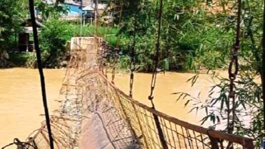 Bahkan ketinggian air sungai sampai menutupi bagian geladak jembatan yang terbuat dari kayu.