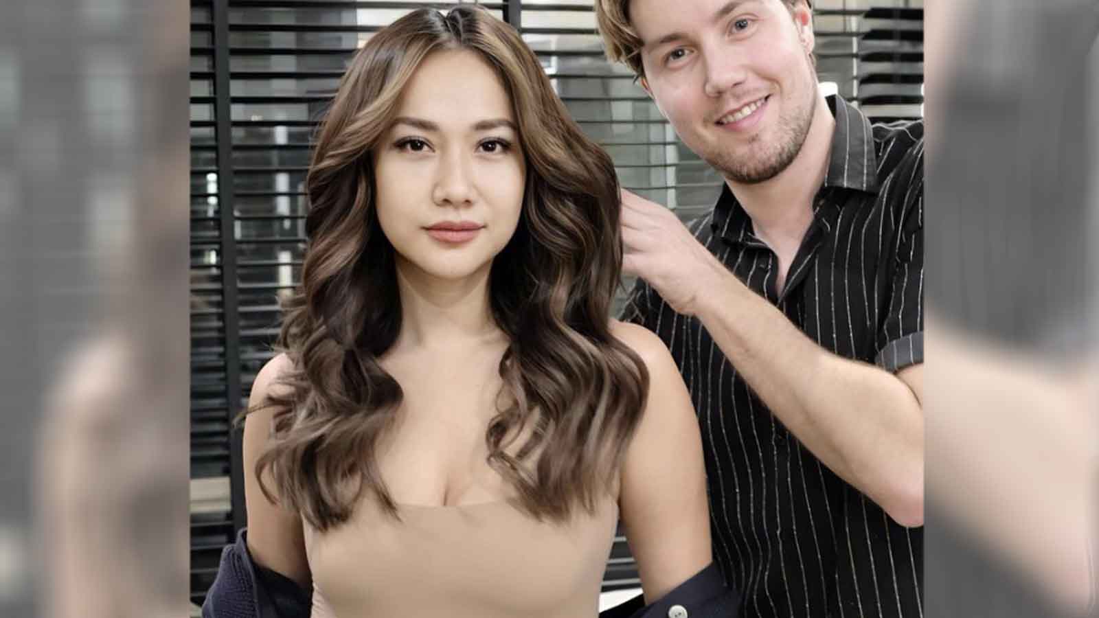 BCL menghadap ke depan kamera, dan pria bule berada di belakangnya, dengan tangan memegang rambut BCL yang bergelombang dan tergerai lepas.