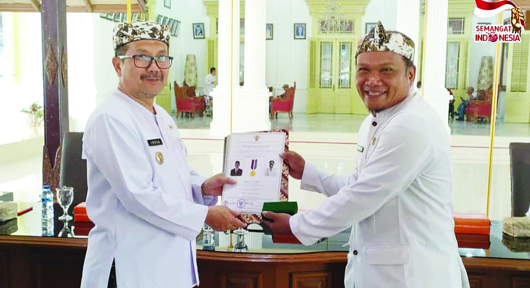 Sekjen FKKC yang juga Kuwu Cibogo, Ahmad Hudori (kanan) menerima piagam Desa Mandiri yang disampaikan Bupati Cirebon, H Imron, di Pendopo Rumah Dinas Bupati, Kamis (19/1/2023).* Foto: Vikcy/Suara Cirebon