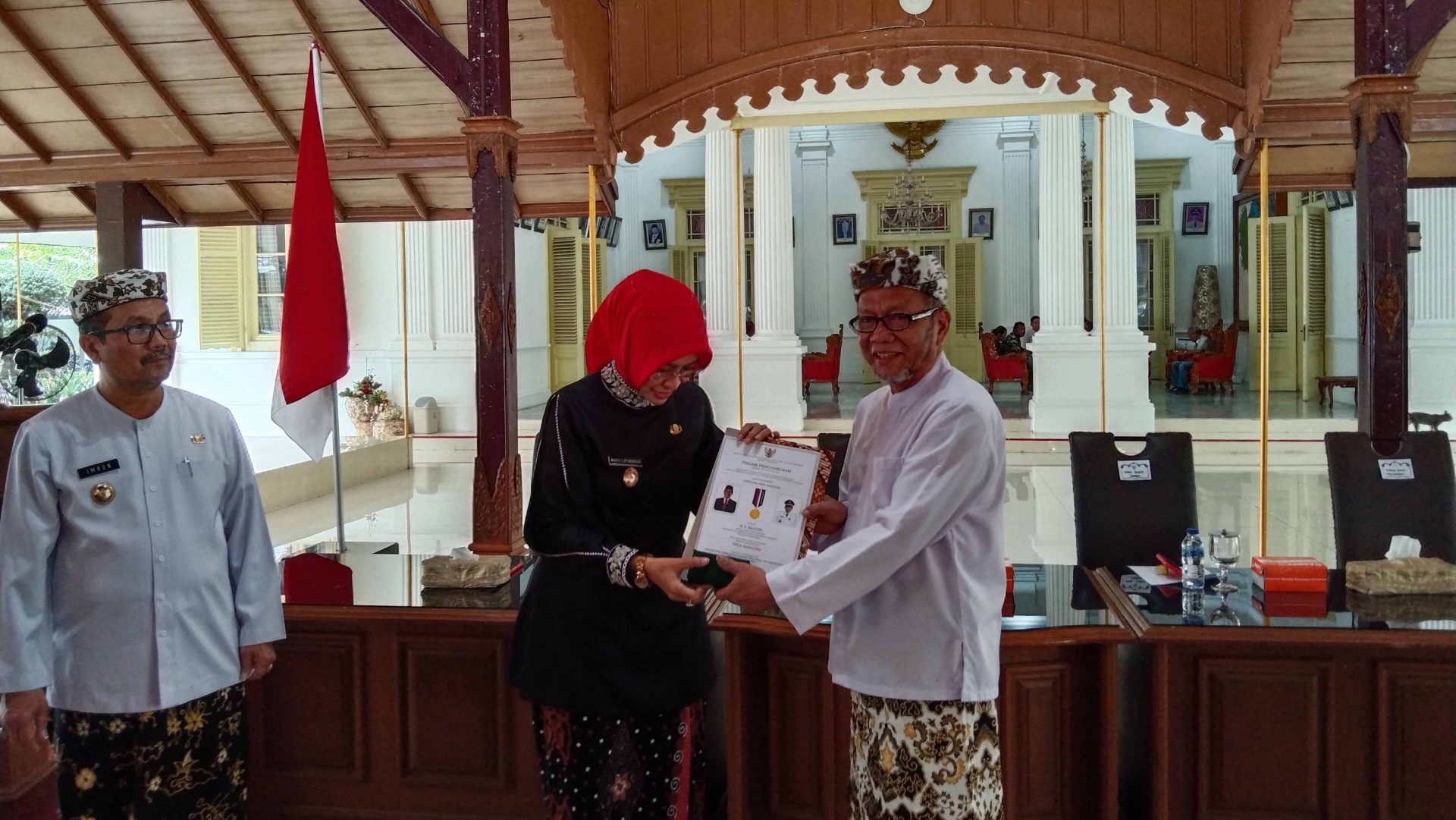 KUWU SINDANGJAWA, H. E Kasturi saat menerima piagam desa mandiri yang diserahkan oleh Wakil Bupati Cirebon, Wahyu Tjiptaningsih, Kamis (19/01).* Foto : Vicky/Suara Cirebon