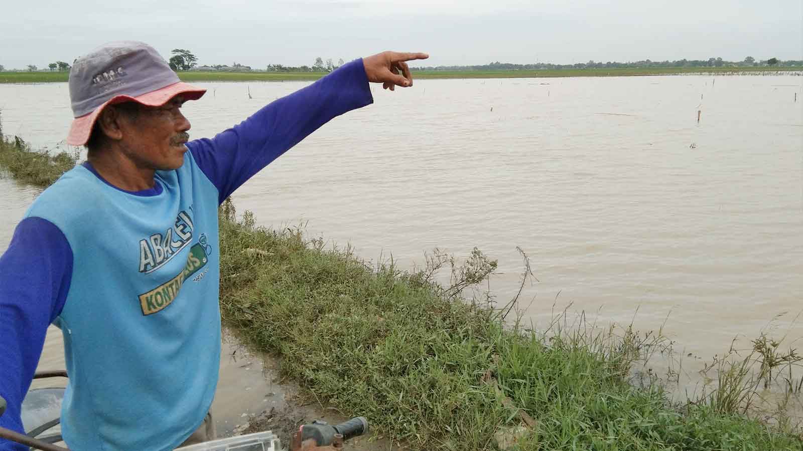 Petani Cirebon asal Desa Bayalangu, Kecamatan Gegesik, Kabupaten Cirebon Bunadi menunjukan kondisi persawahan di wilayah setempat yang masih terendam banjir, Rabu, 25 Januari 2023.* (Foto: Islah/Suara Cirebon)