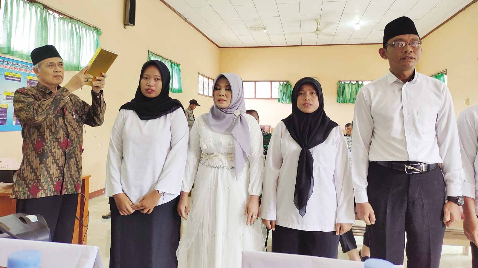 Perempuan yang dilantik menjadi PKD Desa Kalianyar, Kecamatan Panguragan, Kabupaten Cirebon itu, datang ke lokasi pelantikan dengan mengenakan gaun pengantin.