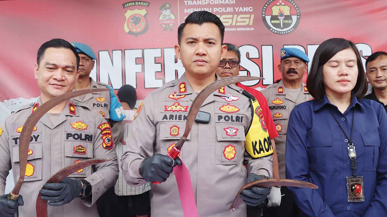 Kapolres Cirebon Kota, AKBP Ariek Indra Sentanu (tengah) didampingi Wakapolres (kiri) dan Kasatreskrim (kanan), menunjukkan barang bukti senjata tajam milik salah seorang anggota geng motor di Cirebon yang menjadi terduga pelaku pengeroyokan saat konferensi pers di mapolres setempat, Rabu, 8 Februari 2023.* (Foto: Surya/Suara Cirebon)