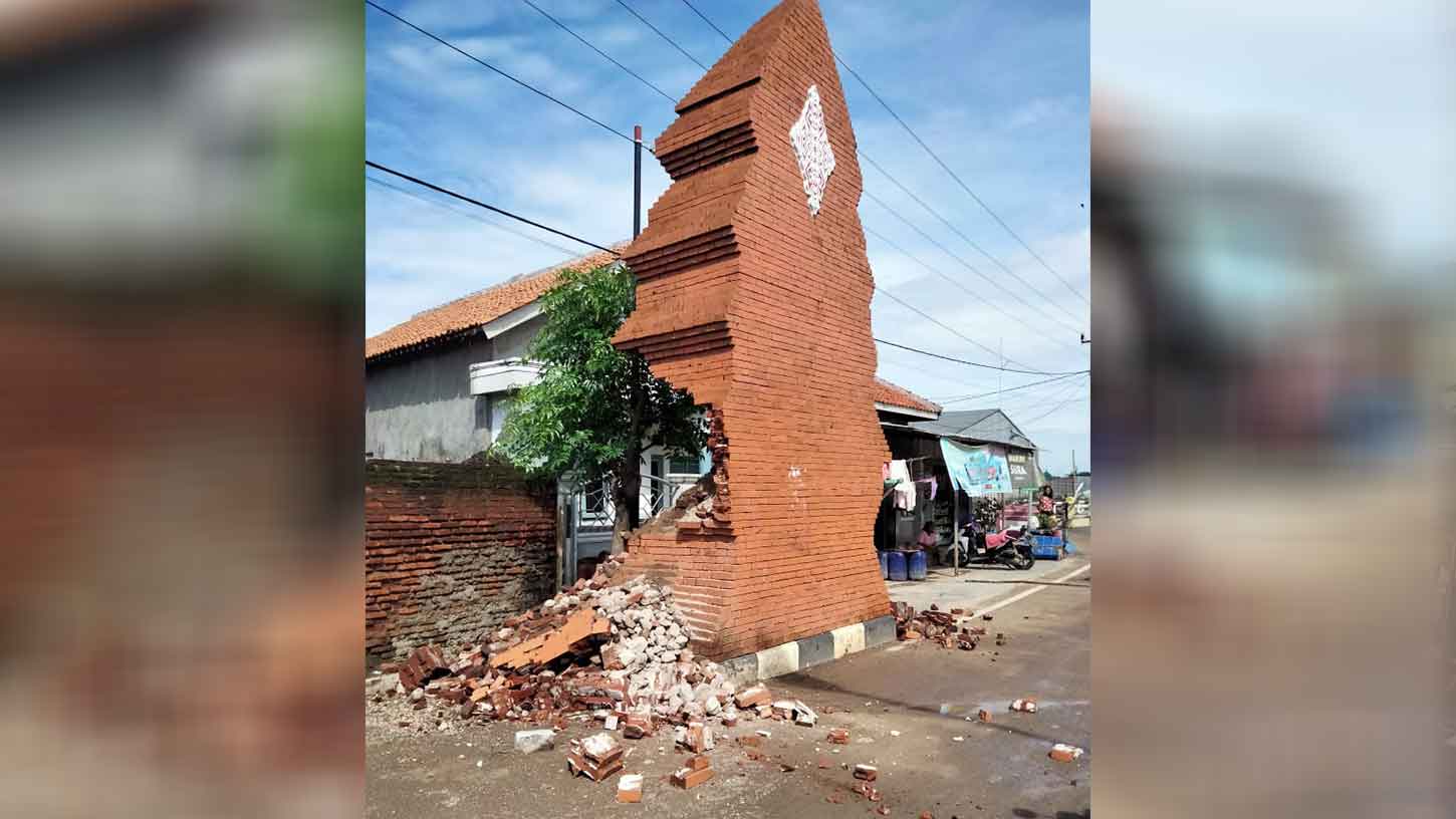 Gapura pintu masuk kawasan Kotaku di Kelurahan Panjunan, Kecamatan Lemahwungkuk, Kota Cirebon, ambruk Selasa pagi, 14 Februari 2023.* (Foto Surya/Suara Cirebon)