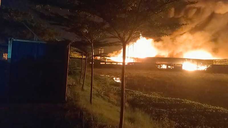 Hingga sekira pukul 23.15 WIB, petugas pemadam kebakaran dibantu TNI, Polri dan masyarakat masih berjibaku memadamkan kobaran api di pabrik tersebut.