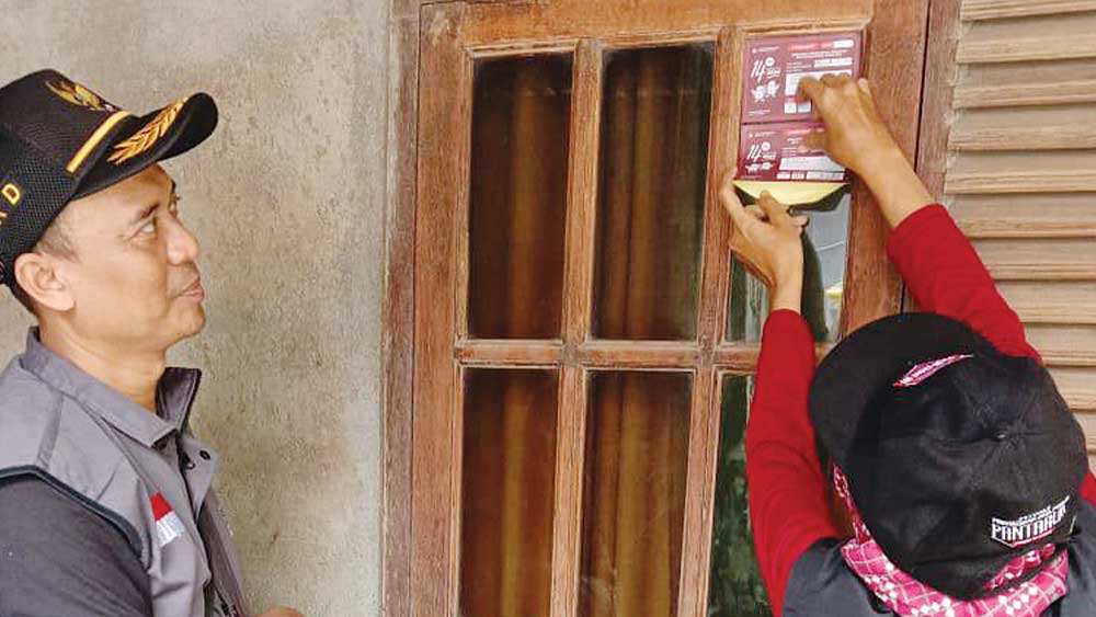 Petugas Pantarlih saat memasang stiker di salah satu rumah warga di Kecamatan Karangsembung, Kabupaten Cirebon, Senin, 6 Maret 2023.* (Foto: Baim/Suara Cirebon)