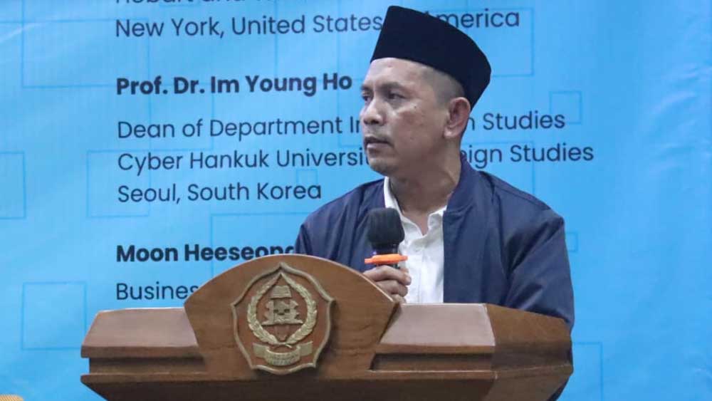 Rektor IAIN Cirebon, Prof Dr Aan Jaelani saat memberikan sambutan dalam Seminar Internasional PJJ PAI FITK IAIN Cirebon pada Selasa, 7 Maret 2023.* (Foto: Humas IAIN Cirebon)