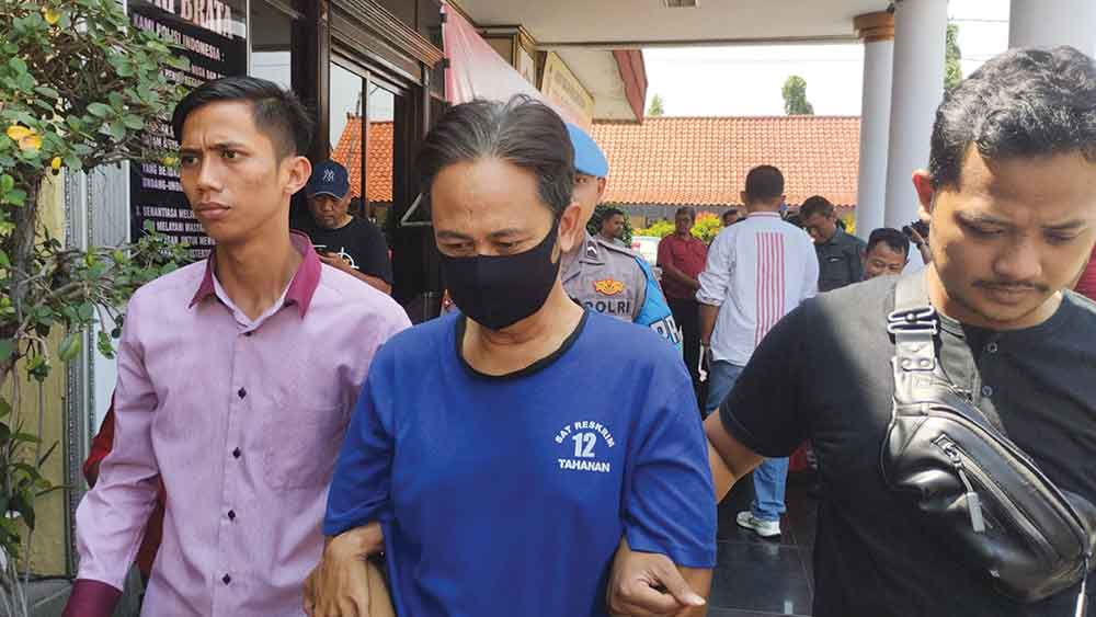 Oknum guru ngaji di Kecamatan Gunungjati, Kabupaten Cirebon, berinisial S digelandang polisi untuk mempertanggungjawabkan perbuatan cabulnya, Jumat, 17 Maret 2023.* (Foto: Sukirno/Suara Cirebon)