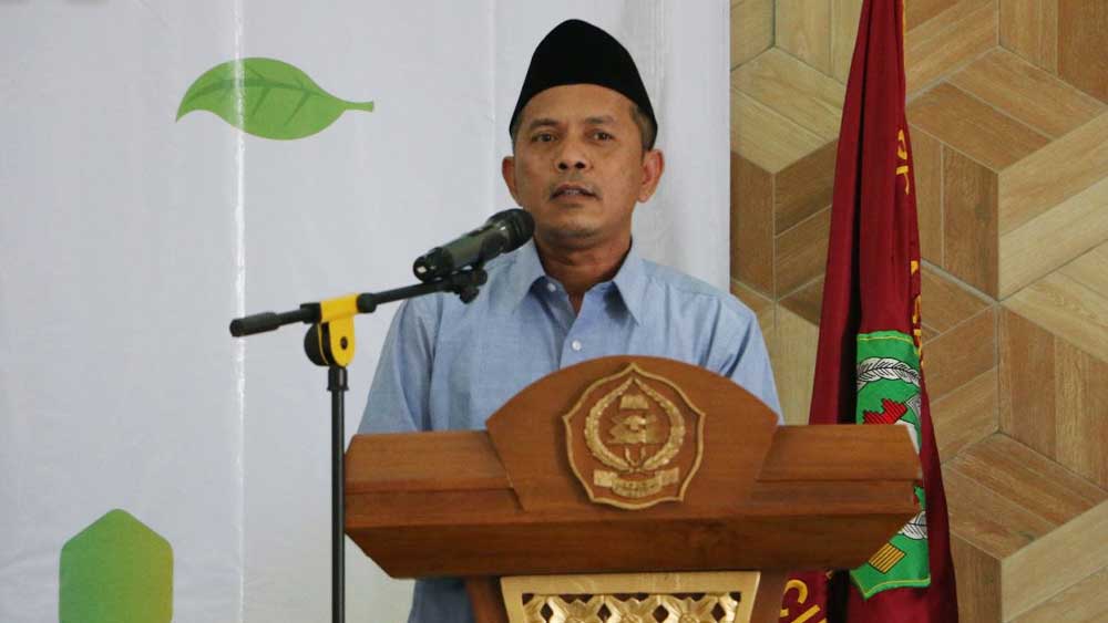 Rektor IAIN Cirebon, Prof Dr Aan Jaelani MAg saat membuka Seminar Literasi Keuangan Syariah dan Waqaf Uang, Minggu, 19 Maret 2023.* (Foto: Humas IAIN Cirebon)